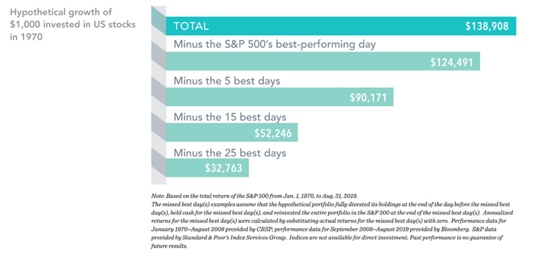 Although moving to cash may be tempting, bank savings will inevitably lose their value in real terms with inflation running at close to double-digits. Market falls can be painful but paper losses only crystalise financially when you sell. Selling also risks being out of the market on positive days which have been a feature of the recent volatility. A study recently showed that missing only a handful of the best-performing days between 1970 and 2019 would cut returns by over 35%, which puts the current market falls into context.