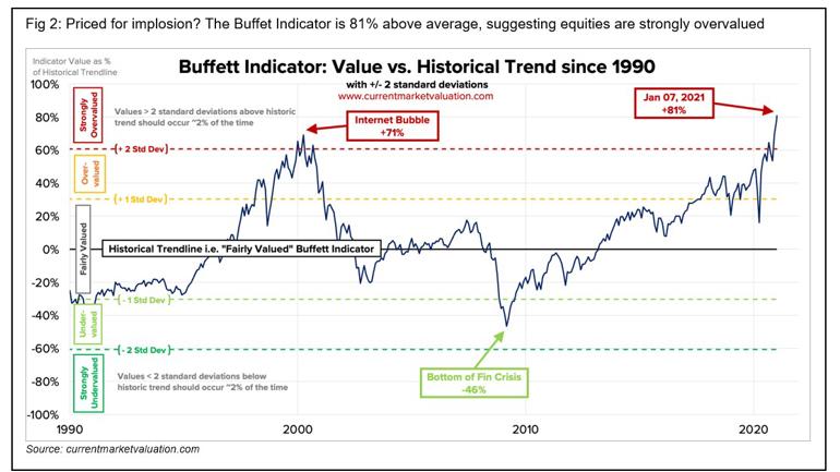 By many metrics the relentless market rise has now propelled it into bubble territory, while the clamour for bitcoins and special purpose acquisition vehicles (SPACs) is further evidence of irrational speculation and the risks that accompany hysteria. There are currently more companies priced at over 100 times their earnings than at any other point in history and 50% more than during the internet bubble at the turn of the century. The Buffett Indicator, which compares total US stock market valuation to GDP, is similarly flashing redder than at any time in history (see figure 2).