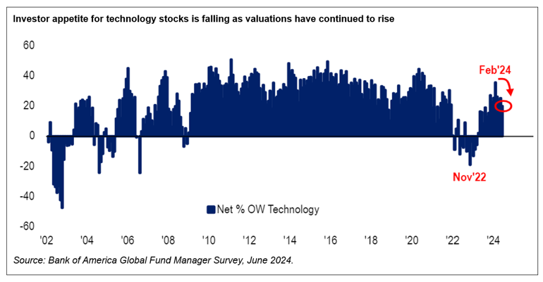The same survey also revealed that investors have been selling tech stocks for three consecutive months with the average allocation now a net 20% overweight, which is its lowest since October 2023 and below the 20-year average of net 22% overweight.