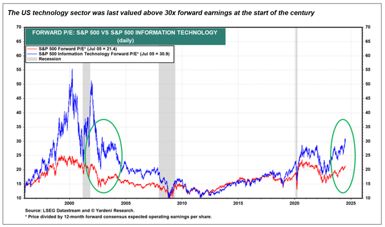 The benefits of investing globally should also not be underestimated. Valuations in emerging markets and Europe remain attractive with forward earnings multiples below long-term averages and at record discounts to the US of 40% and 30%, respectively. Even in the US, where most sectors are trading above long-term averages, the headline P/E multiple is heavily skewed by the IT sector which is now priced 70% higher than its own 10-year average and at a level last seen when the dot com bubble burst.