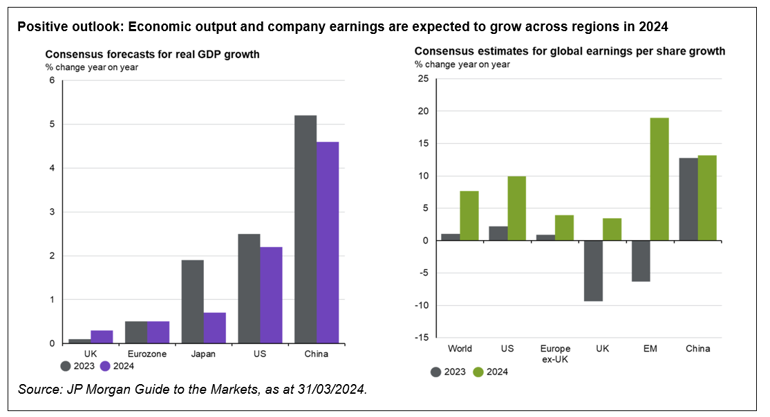 Underpinning the rally has been an improving economic and earnings outlook. GDP is forecast to grow in most regions and labour markets around the world remain strong. Inflation generally continues to fall, albeit more slowly than expected in many countries, and interest rate cuts are within sight as a result. With investors increasingly convinced that we will achieve a soft economic landing and avoid recession, company earnings are expected to grow in all major markets.
