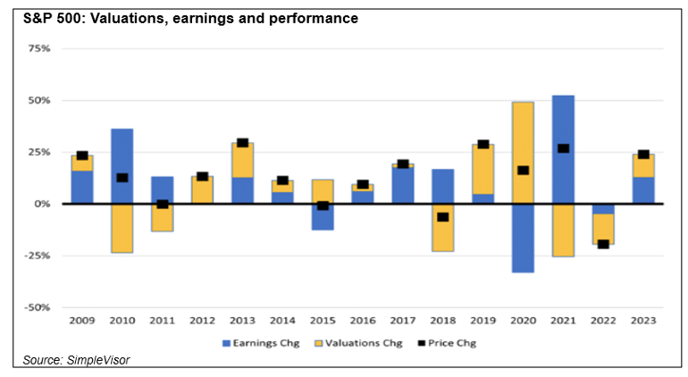 So, what does this mean for stock market returns? Over the long-term, valuation is the main driver with multiple expansion or contraction dictating equity performance, regardless of earnings or margins. The chart below shows how changes to valuation and earnings have contributed to the S&P 500 return each year since the financial crisis. For example, the index was up 24% last year with rising earnings and increasing valuations contributing equally.