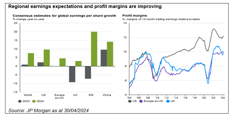 The current environment of positive economic growth, higher-for-longer interest rates and reasonable valuations (outside US tech) should be favourable for value stocks whose earnings and valuations tend to benefit most from a cyclical recovery. Consensus forecasts show that corporate earnings are expected to improve across all regions this year, while margins are also improving.