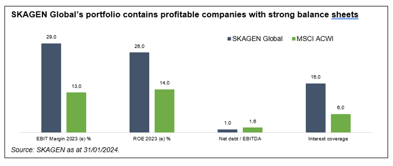 A good example is long-term holding ASML, which gained 15% after revealing record profits at the end of January on the back of rising global demand for its chip-making equipment, as Knut Gezelius, SKAGEN Global’s Lead Portfolio Manager, explains: “ASML has a quasi-monopolistic market position in producing the cutting-edge lithography machines used to manufacture semiconductors. It announced much higher orders than the market expected and should also benefit from an upswing in the chip cycle driven by rising smartphone and PC sales, as well as strong demand for AI.” The Dutch company is currently a 3.7% position in Global’s portfolio and its top contributor in 2024 with its share price climbing 30% year-to-date.