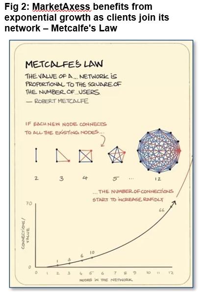 If MarketAxess continues to grow its share of an expanding market it should benefit from a powerful network effect – Metcalfe's Law – which would become increasingly valuable (see figure 2). Amazon followed a similar trajectory and MarketAxess shares its growth-centric business model and strategy of passing on low costs to customers to boost their experience and volumes.