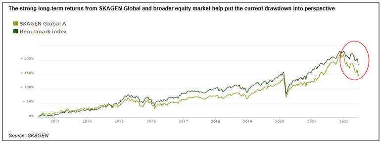 These worries have pushed global equities down nearly 12% year-to-date and into bear market territory[1]. For SKAGEN Global, 2022 has been particularly challenging – the fund lags the index by around 7% – but the portfolio remains strong and well-positioned to continue helping clients 'get rich slow'. The fund's performance over our recommended holding period (5-years+) also remains very healthy with 8.6% annualised returns over 5-years, 9.8% over the last decade and 13.0% since launch in 1997[2].