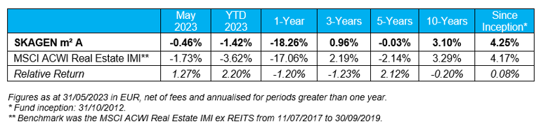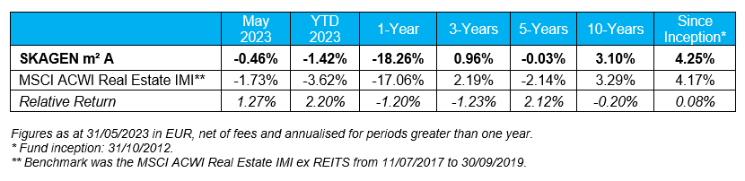 LOG lead relative gains as higher interest rates weighed on global real estate markets. SKAGEN m² fell 0.46% over the month, outperforming the MSCI All Country World Index Real Estate IMI benchmark which dropped 1.73%. Read the SKAGEN m² May 2023 report for more information.