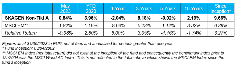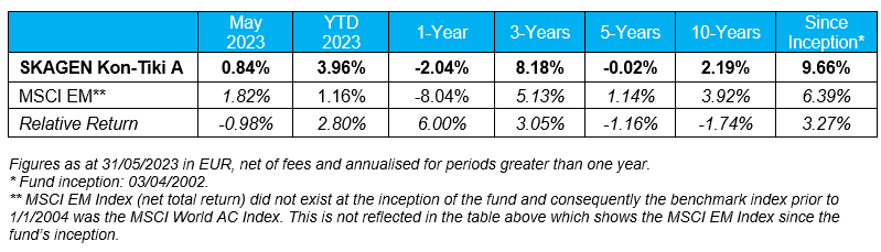 Chinese holdings drove relative weakness as EMs underperformed DMs on weak China data. SKAGEN Kon-Tiki was up 0.84% during the month, trailing the MSCI Emerging Markets Index which was 1.82% higher. Read the SKAGEN Kon-Tiki May 2023 report for more information