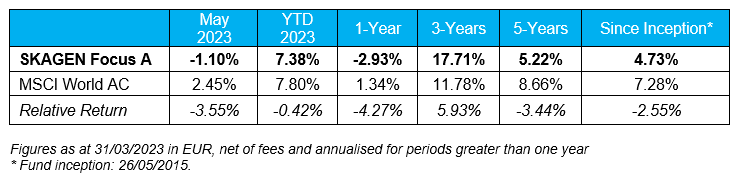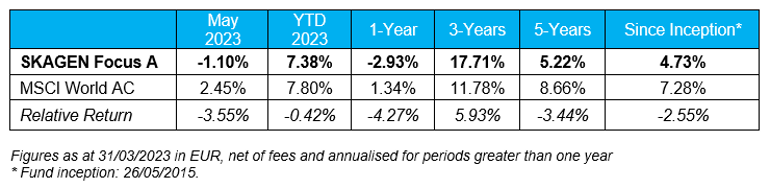 Panasonic gains were offset by CCS weakness as LG Household & Healthcare entered the portfolio. SKAGEN Focus fell 1.10% during the month, lagging the MSCI All Country World Index which added 2.45%. Read the SKAGEN Focus May 2023 report for more information.