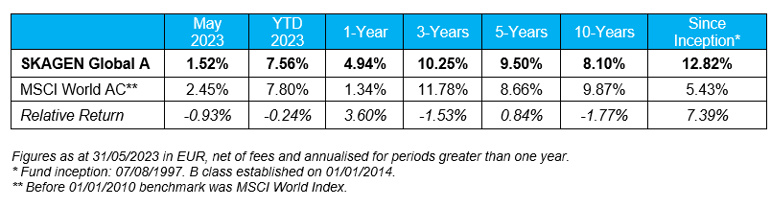 Estee Lauder weakness offset Google strength as global equities moved sideways. SKAGEN Global added 1.52% during the month, lagging the MSCI All Country World Index which climbed 2.45%. Read the SKAGEN Global May 2023 report for more information.