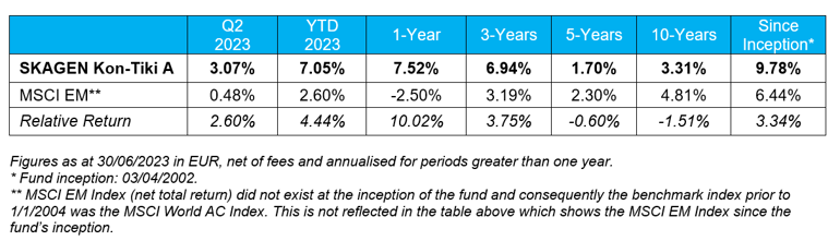 Brazilian holdings drove portfolio gains as Emerging Markets underperformed Developed Markets on China sluggishness. SKAGEN Kon-Tiki was up 3.07% during the quarter, outperforming the MSCI Emerging Markets Index which was 0.48% higher. Read the SKAGEN Kon-Tiki Q2 2023 report for more information.