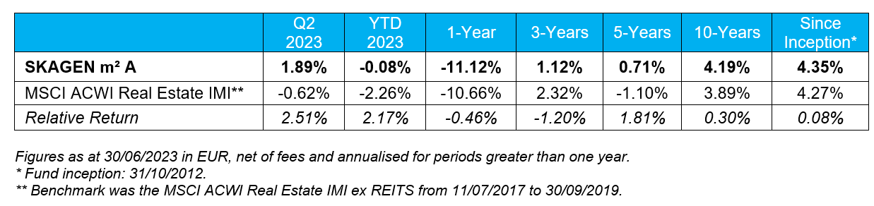 LOG drove relative gains as market conditions become increasingly favourable for listed real estate. SKAGEN m2 rose 1.89% over the quarter, outperforming the MSCI All Country World Index Real Estate IMI benchmark which dropped 0.62%. Read the SKAGEN m2 Q2 2023 report for more information.