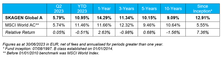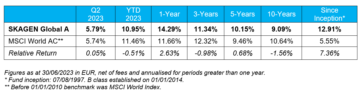 US holdings led absolute and relative gains as TMX Group entered the portfolio. SKAGEN Global added 5.79% during the quarter, beating the MSCI All Country World Index which climbed 5.74%. Read the SKAGEN Global Q2 2023 report for more information.