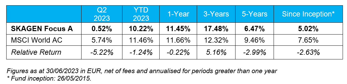 Panasonic strength was offset by E-mart weakness as a few large cap tech stocks drove market gains. SKAGEN Focus added 0.52% during the quarter, lagging the MSCI All Country World Index which climbed 5.74%. Read the SKAGEN Focus Q2 2023 report for more information.