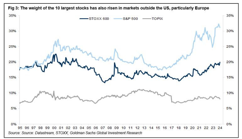 Although headlines have centred on the Magnificent Seven, rising concentration is not only a US phenomenon. Markets have become increasingly narrow across the globe with the largest emerging market companies contributing an even bigger share of five-year index returns than in the US, according to Morningstar data, although this has been in the context of much weaker performance. In Europe, where the ten largest holdings now account for nearly a quarter (23%) of the index[3], market concentration is at its highest since the 2008 Global Financial Crisis.