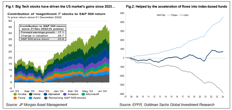 For several months I have explored the growing dominance of a handful of US technology companies and the distortion this has created for global stock markets. Since the start of 2023, the Magnificent Seven stocks[1] have contributed more than three quarters of the S&P 500‘s 44% return and just three (Nvidia, Meta and Alphabet) have provided well over half of these gains (figure 1). This strong performance has seen the septet grow to nearly a third of the overall US market size and almost a fifth of the global stock market[2] – well above the peak of the dot com bubble when the largest seven tech stocks made up around of a fifth of the S&P 500 index weight.