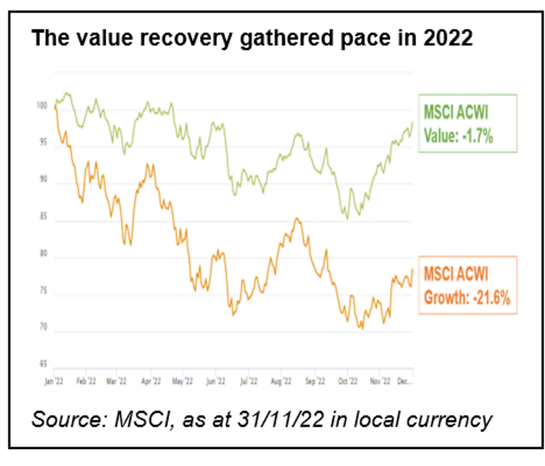 Even after a very strong year in relative terms, value is still priced at an above average discount to growth. In the US, value stocks have a forward P/E of 15.4x versus 26.2x for growth; a ratio of 0.6 (see chart below). A return to the historic average of 0.75 would see value rising by around 30% or growth falling by 20% – an even greater margin of outperformance than we have seen in 2022[1].