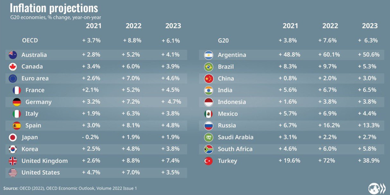Despite downgrading forecasts, the OECD believes economic growth will remain positive with global GDP expanding 3.0% this year and 2.8% in 2023. All major economies except Russia are predicted to avoid recession and they see little risk of repeating the 'stagflation' of the 1970's when high inflation met surging unemployment.