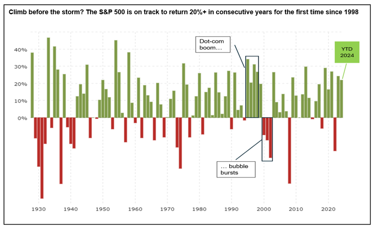 In the short-term, stocks have historically tended to be muted between election day and the year-end. The S&P 500 index is currently at an all-time high after climbing 22% this year – a similar return at the end of December would mark a second successive calendar year gain over 20%. Before we pop the champagne corks, it is worth considering that the last time we had consecutive 20%+ returns (1995-1998) it preceded a 50% drop when the internet bubble burst and it took another five years to reach a fresh all-time high.