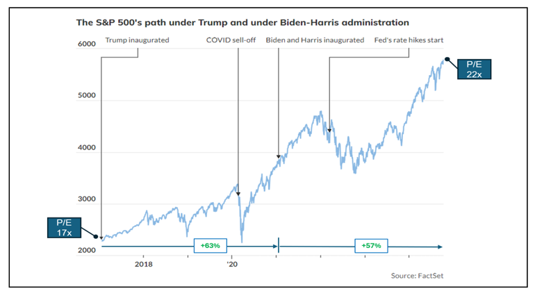 During Trump’s first term in office the US stock market was one of his favourite KPIs for the country’s (and his own) performance. The S&P 500 index rose 63% during his administration – a four-year period that included the steep COVID sell-off in 2020 – similar to its return since Joe Biden took over in 2021.