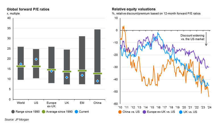 A postscript to the year-end rally is that valuations in developed markets are now above historic averages, particularly in the US where headline multiples are skewed by the MAG-7. In Europe (notably the UK) and emerging markets (notably China) valuations remain well below 30-year averages, while their relative discounts to US equities are at record highs and continue to grow. A benefit of bottom-up investing is that even in the US, where 70% of stocks underperformed the index last year and roughly a third actually fell in price, there is value to be found.