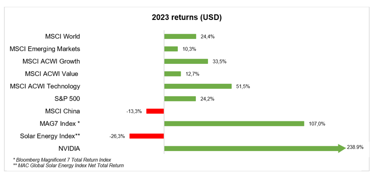 This unlikely Goldilocks scenario helped global equities to close 2023 up 23% and deliver the best calendar year return since 2019[1]. As has been widely reported, the ‘Magnificent Seven’ did most of the heavy lifting, propelling the US S&P 500 index (of which Alphabet, Amazon, Apple, Meta, Microsoft, Nvidia and Tesla now represent 30%) to new highs while the Nasdaq 100 index of large tech stocks had its best year since the dotcom bubble burst, rising by more than 50%.
