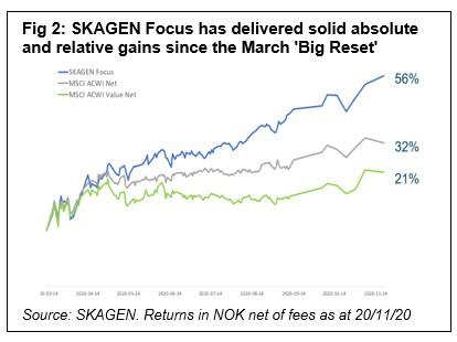 Moreover, travel and leisure-related companies are clearly trading significantly below their normalized earnings power and would be major winners in the more normal investment environment of a post-COVID world. The banking sector, again, could see normalized provision levels following an elevation during the pandemic and we believe it has the potential to distribute substantial capital returns in 2021 and onwards since the 2019 dividend has been largely held back in 2020. SKAGEN Focus has meaningfully increased its exposure towards this under-owned segment as of late.