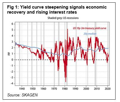 The yield curve, as measured by the US 10-year treasury bond yield minus the 3-month equivalent, is now steepening (see figure 1). This typically indicates stronger economic activity with rising inflation and expectations of economic expansion. If continued, we believe this has important implications for global equity markets.  First, higher interest rates will ignite the financial sector which has underperformed severely for several years. Banks will be boosted by increased net interest margins and enhanced reinvestment yields. The latter will also benefit insurers who will see a better future return on their bond portfolios and reduced pressure on fulfilling guaranteed interest rate products. Second, the yield curve steepening will also implicitly de-rate the earnings and valuations of mega-cap technology companies in the US. These stocks are today effectively bond proxies and rising discount rates will reduce the current value of their future profits and therefore their shareholder value.