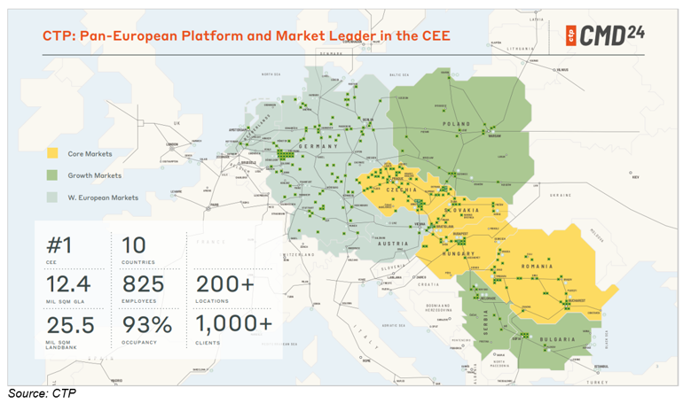 Around three quarters of CTP’s assets are in the Czech Republic, Romania, Hungary and Slovakia, with average market share of 28% across the four countries. Its largest exposure is in the Czech Republic, where it is the biggest player in one of Europe’s strongest logistics markets.