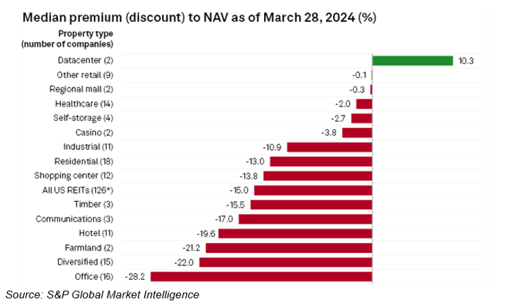 In the US, where SKAGEN m2 has the majority (36%) of its assets, REITs currently trade at a 15% discount to NAV with only the data centre segment trading at a premium and others, notably offices, priced at deeply discounted valuations: