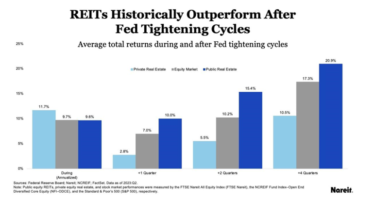 At its latest meeting, the Fed reaffirmed that there are unlikely to be further interest rises despite sticky inflation and futures markets currently expect borrowing costs to start steadily falling in the second half of 2024 across both sides of the Atlantic. From this point in previous cycles, listed real estate has outperformed both direct real estate and the broader equity market: