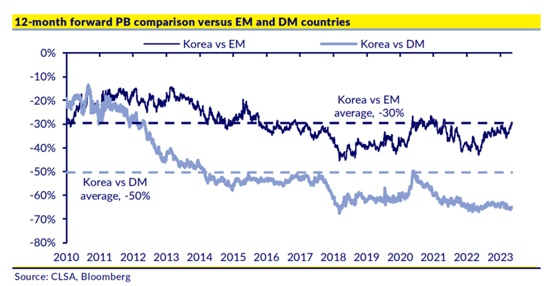 The Korea discount is particularly wide in the country’s banking sector where companies often trade at steep discounts to book value and on low earnings multiples as a result of poor capital allocation. Despite generating similar return on equity to overseas peers, Korean banks have historically been much less generous in returning profits to shareholders.