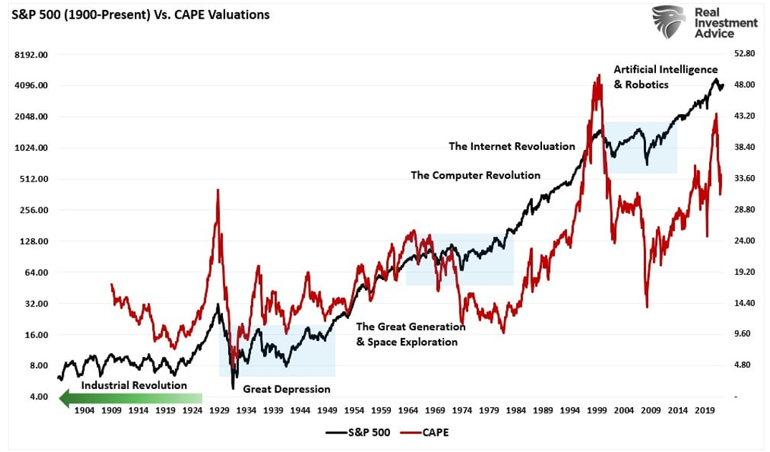 Previous periods of technological transformation have coincided with some of the best stock market returns but before getting too carried away, history also shows the importance of valuation. The chart below plots the S&P 500 index (black line) against its cyclically adjusted P/E ratio (red line) with blue bars indicating periods with zero returns. It shows that phases of rapid digital change don't translate into stock market gains when valuations are high, as they are at present.