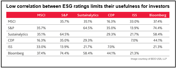 The different methodologies and measurement systems used can produce wide-ranging results and often contradictory recommendations. A recent CFA study of the six largest providers of ESG ratings for over 400 companies across 24 industries found weak correlation between scores with most below 50% and some as low as 7% (see table). By comparison, the three largest credit rating agencies had a correlation of between 94% and 96% for the same companies.