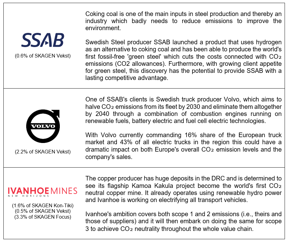 The good news for stock pickers like SKAGEN is that companies also face rising pressure from their own clients to set climate targets and scrutiny over how, when and whether they're being achieved. Regulators and industry bodies play an important role here too, particularly in standardising disclosure; the Task Force on Climate-Related Financial Disclosures (TCFD) and recently launched International Sustainability Standards Board (ISSB) being notable initiatives.